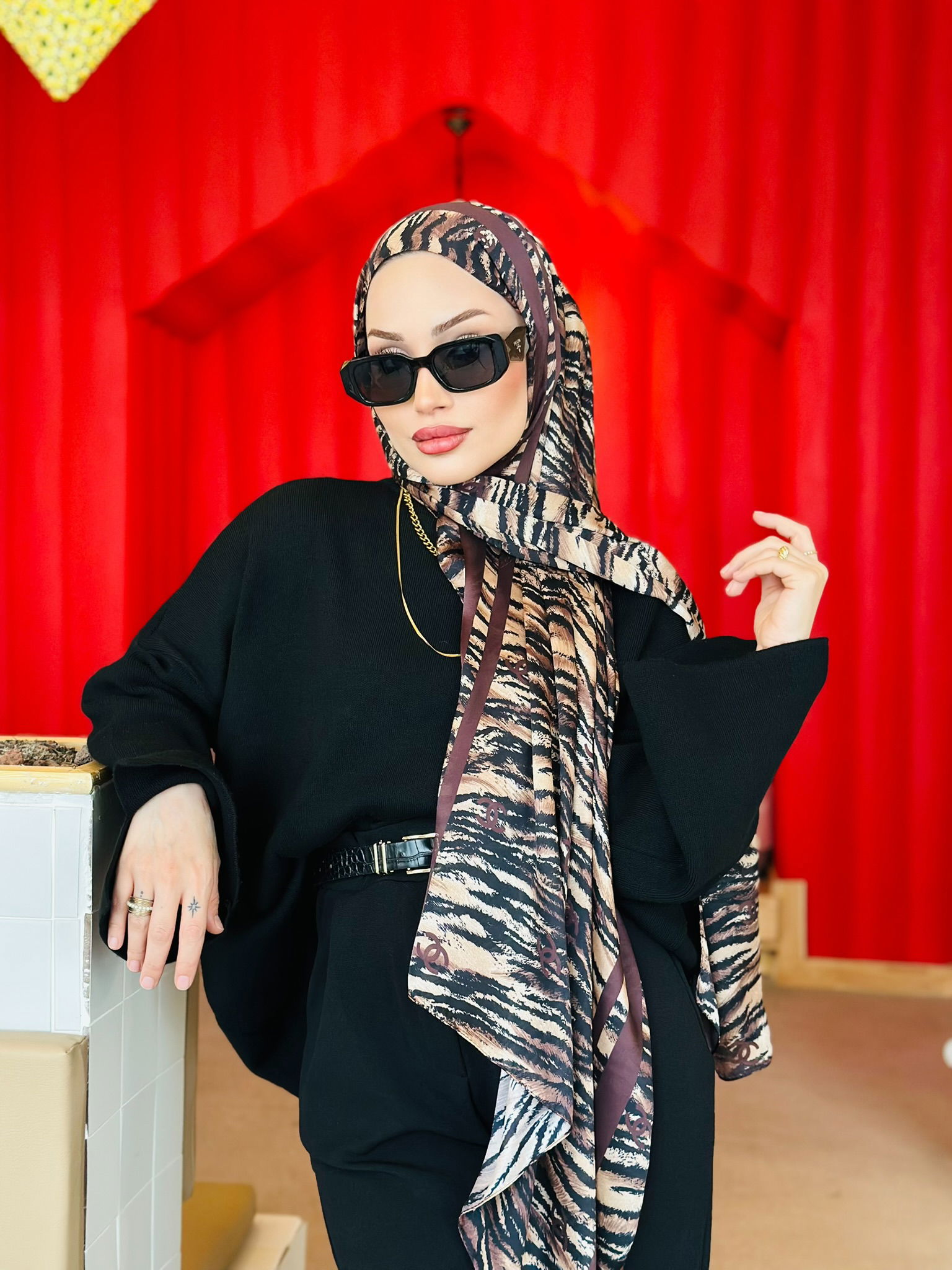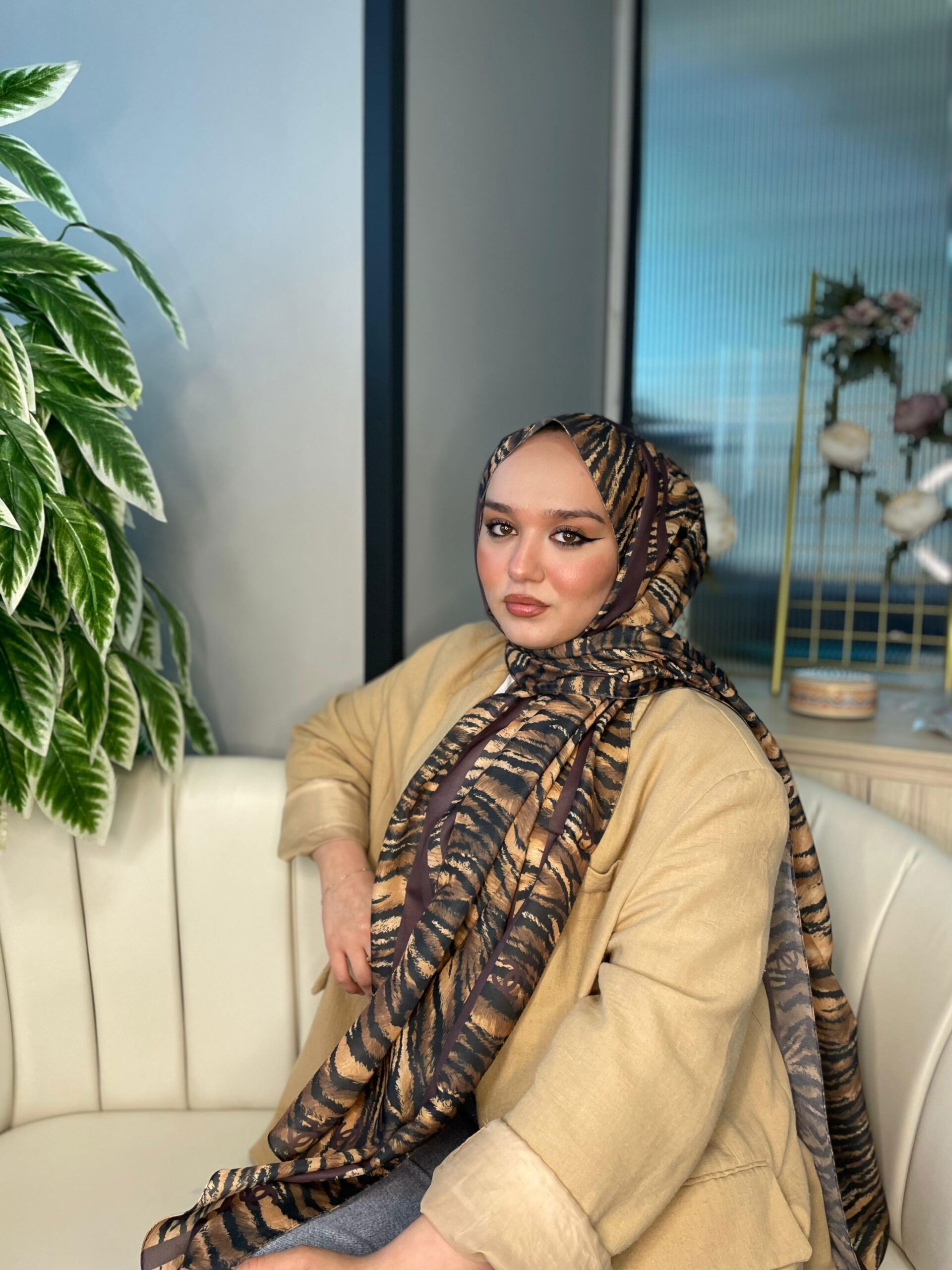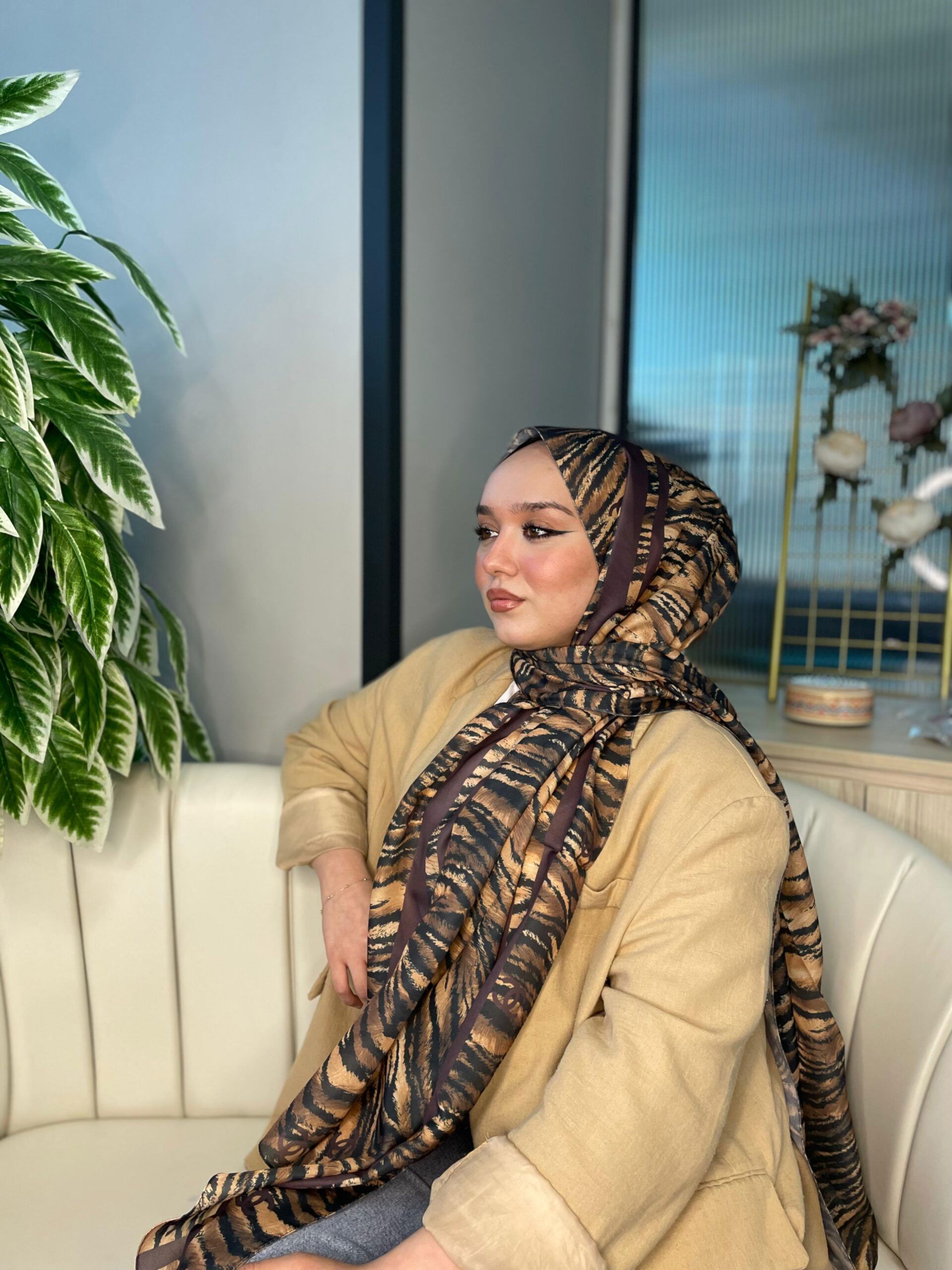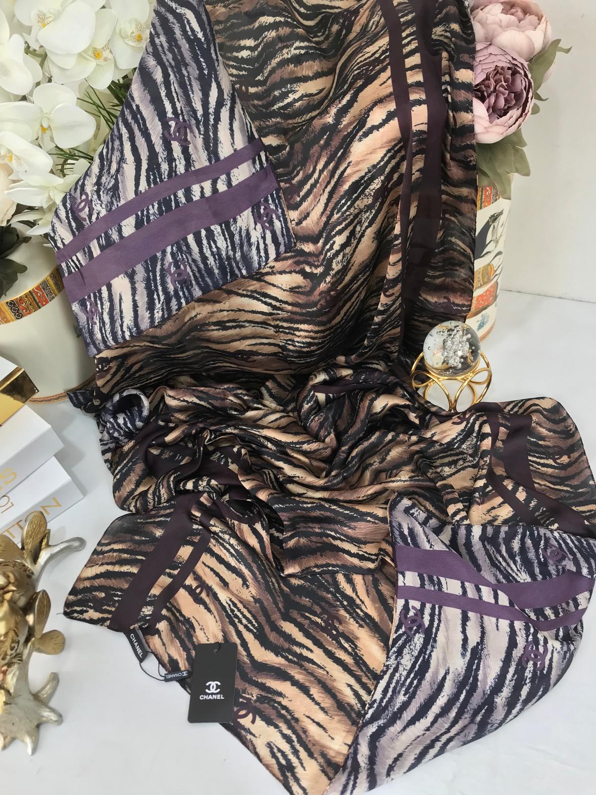 Channel Çizgili leopar çifttaraflı vual ipek şal-43080 Koyu kahve