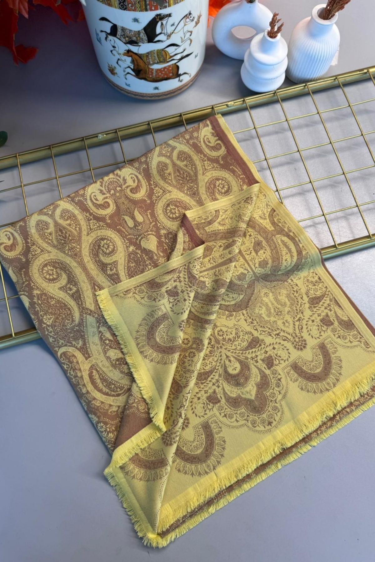 Dubai Kendinden Dokulu Çift Taraflı İpek Şal – 5252- Limon