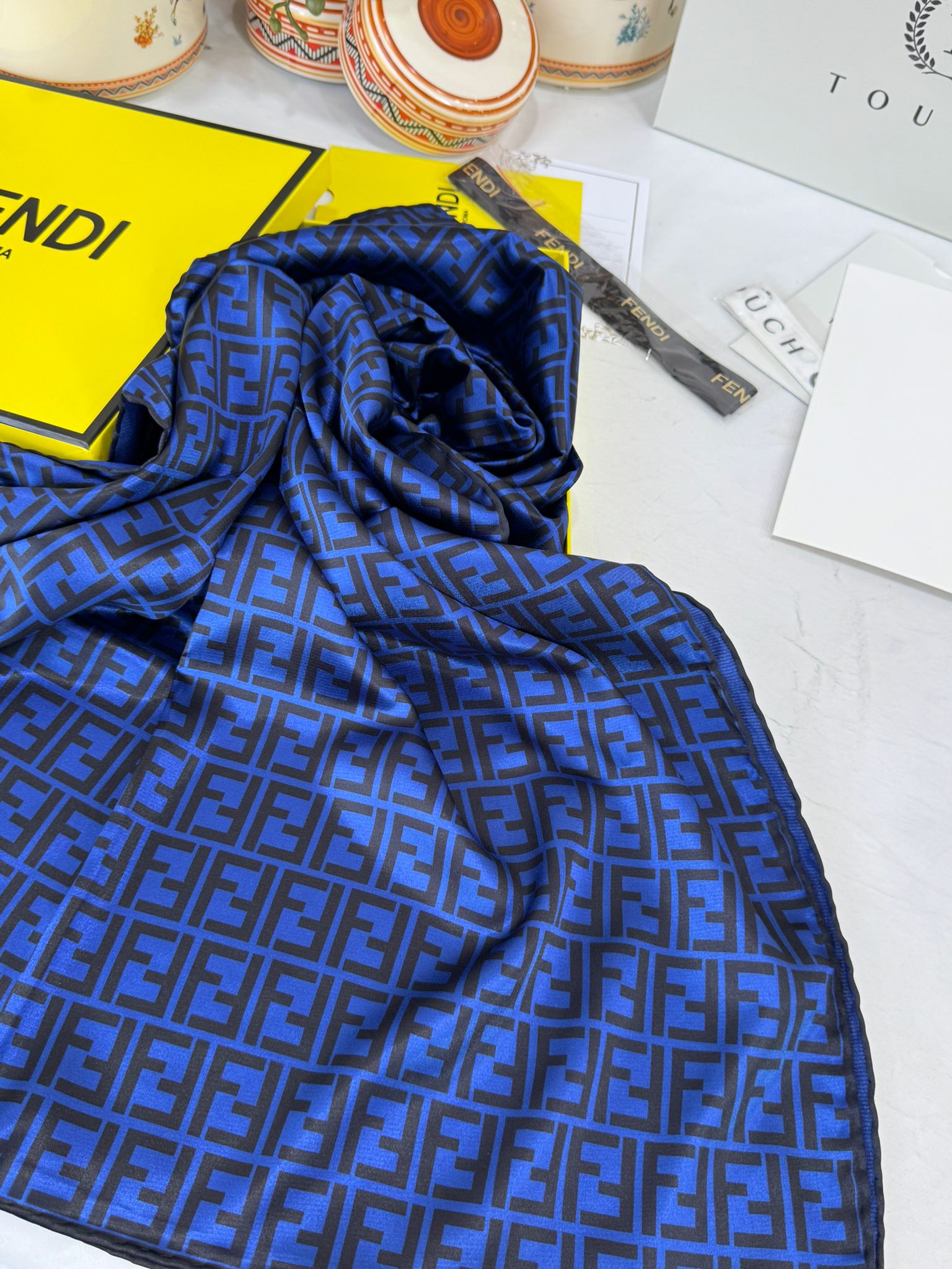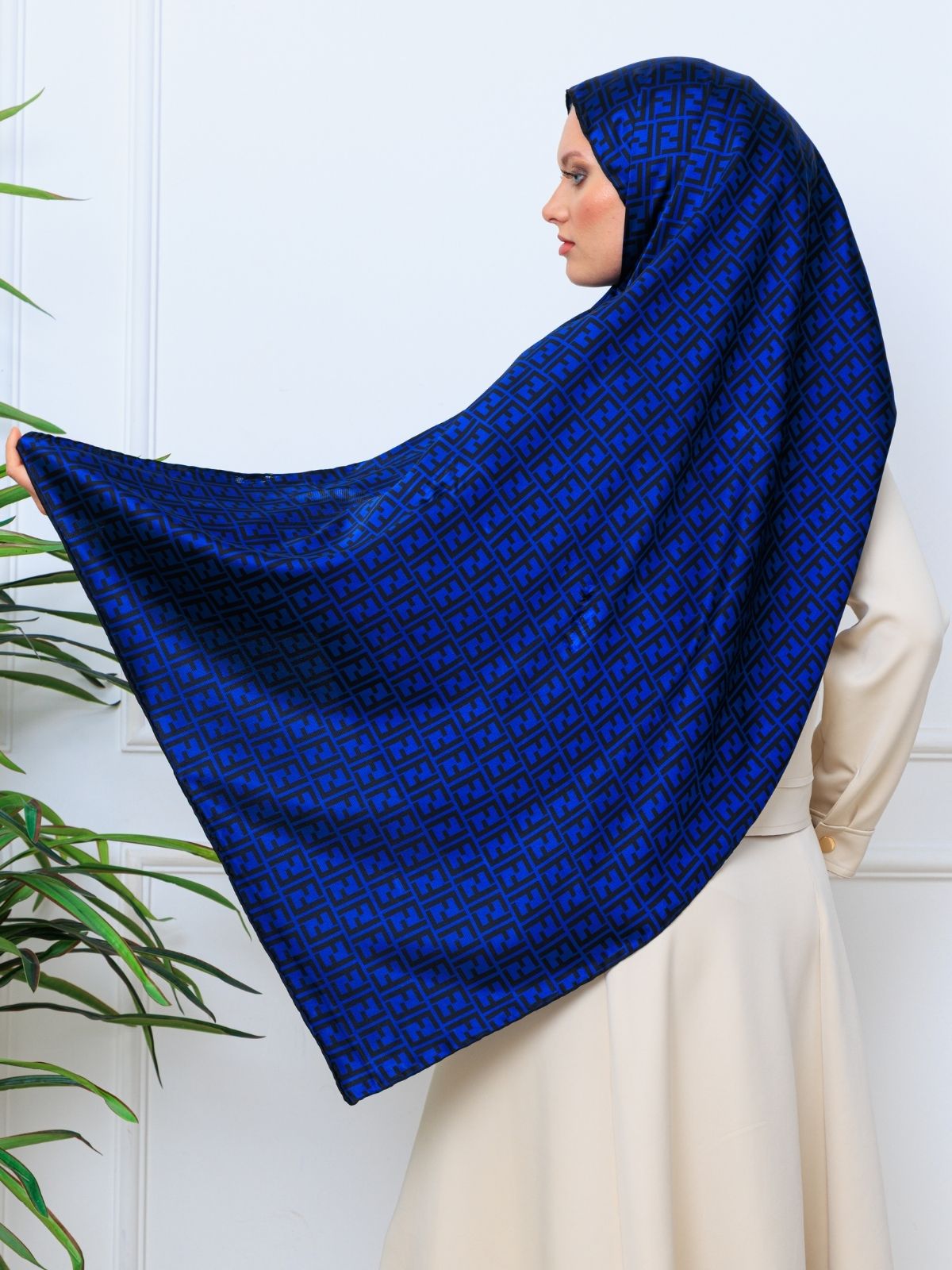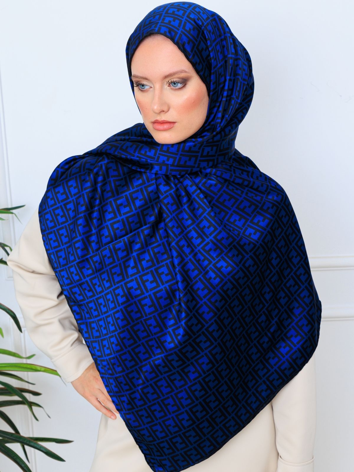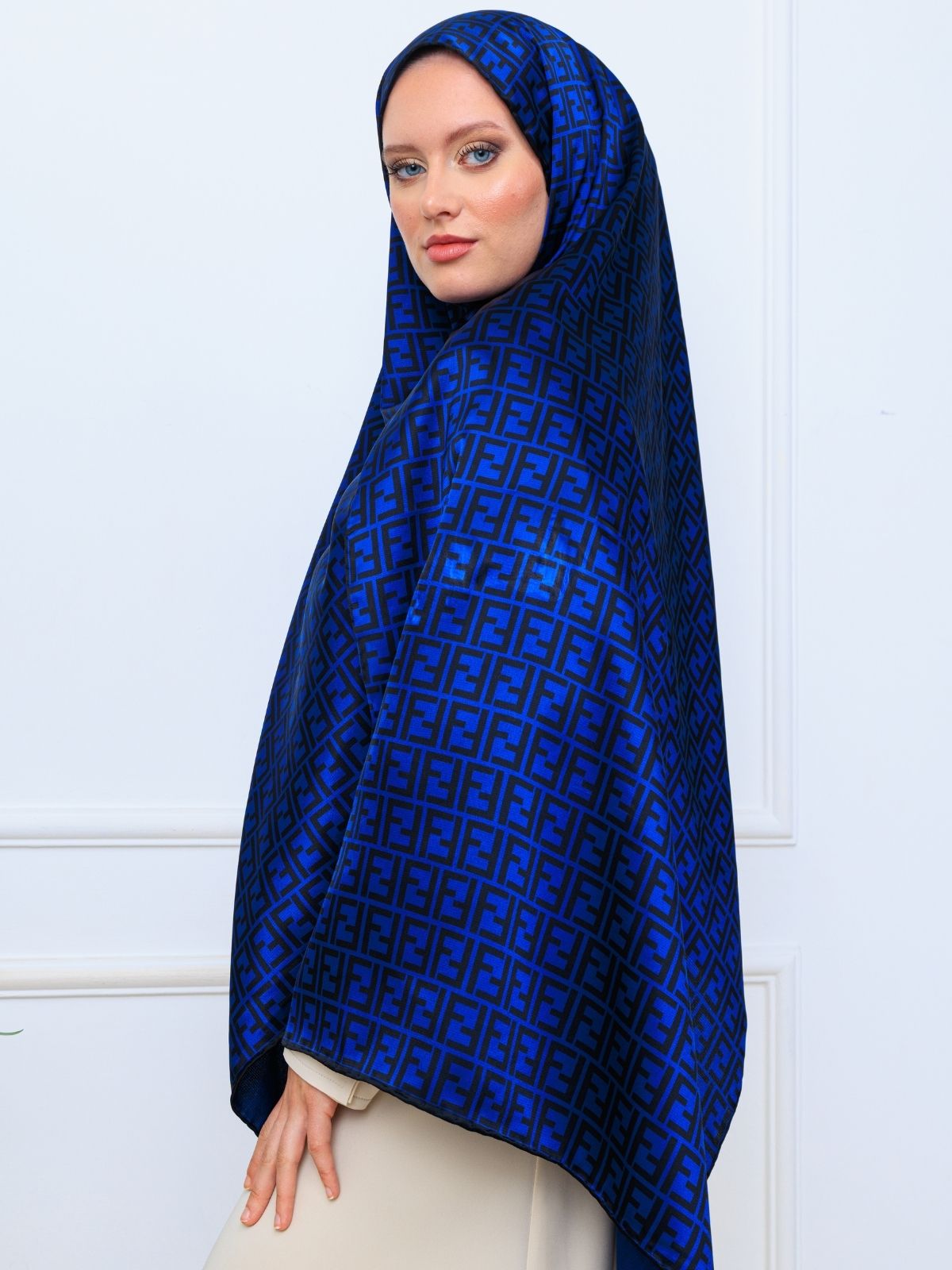 İthal Çifttaraflı Fendi İnci Vual İpek Şal-14500 -Lacivert