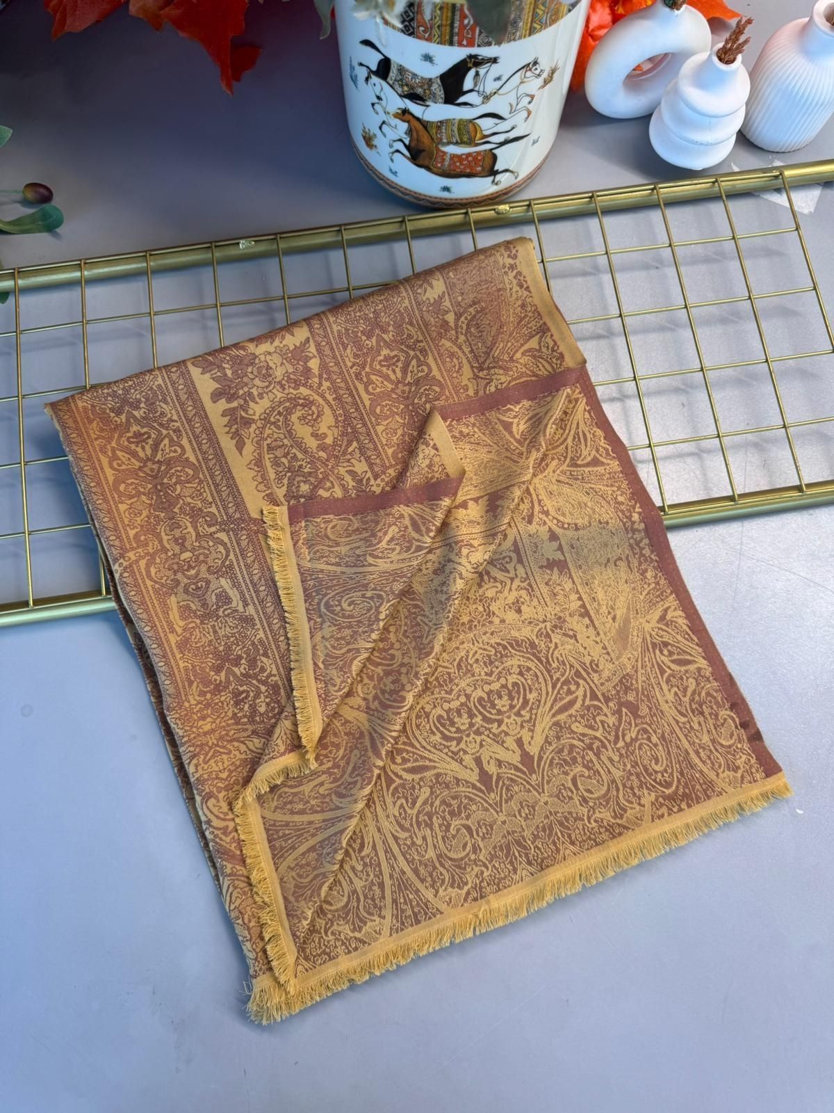 Liva Kendinden Dokulu Çift Taraflı İpek Şal – 9897 – Kahve