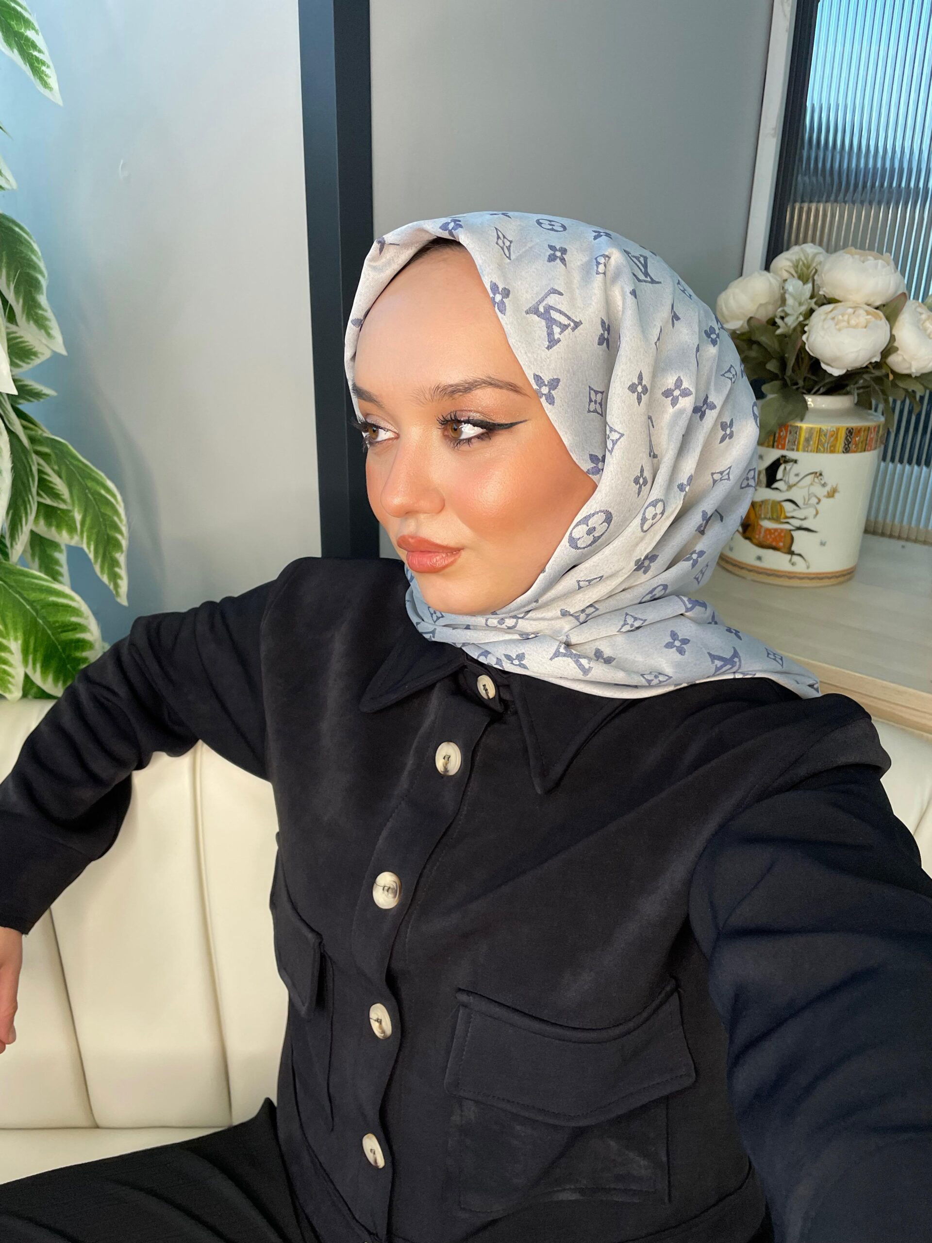 Lv Desenli İpek Kaşmir Çift Taraflı Şal – Kot Mavisi