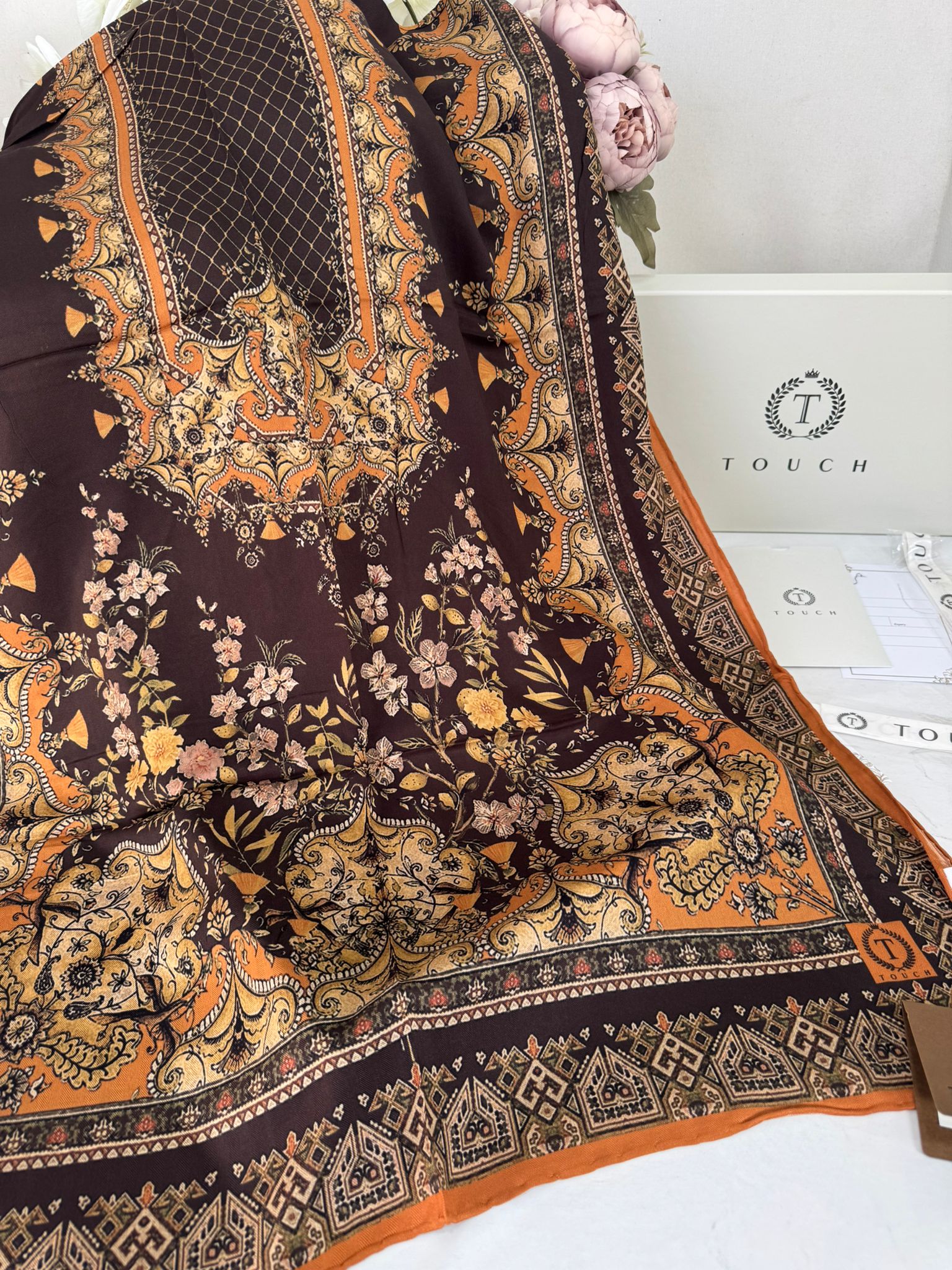 Touch İthal Etnik Desen Yün İpek Şal-34770 -Turuncu kahve