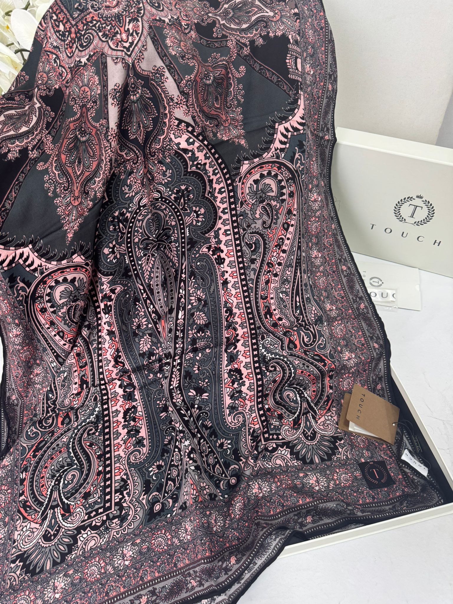 Touch İthal Etnik Desen Yün İpek Şal- 35110 – Siyah Pudra